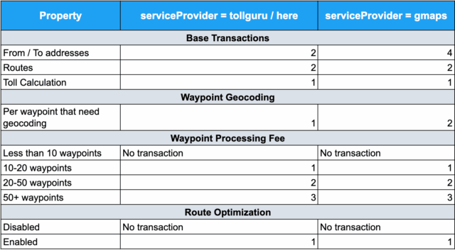 Transaction calculation depends on the routing service provider (serviceProvider) specified in your request (tollguru / here / gmaps). Geocoding is performed when you provide addresses without latitude/longitude coordinates for waypoints. Each geocoding counts as 1 transaction for tollguru, here, and 2 transactions for gmaps. Additional transactions are added based on the total number of waypoints (see “Waypoint processing”) and whether route optimization (optimizeWaypoints) is enabled in the request.