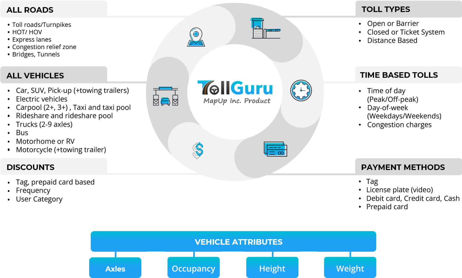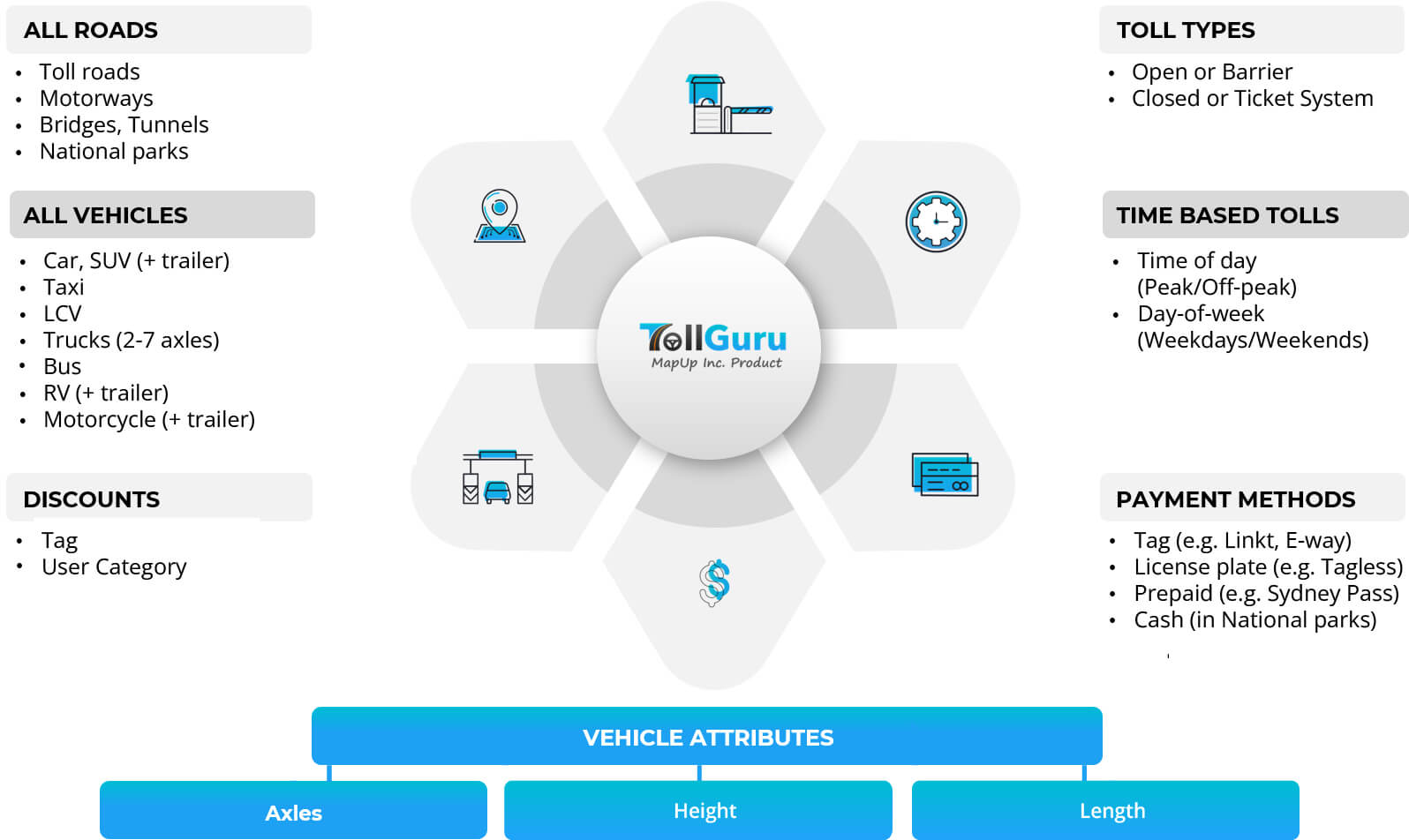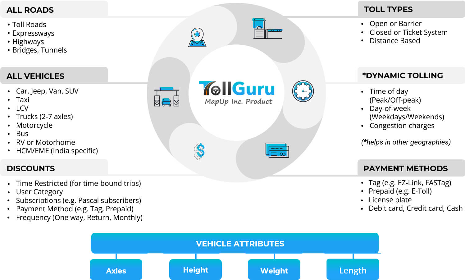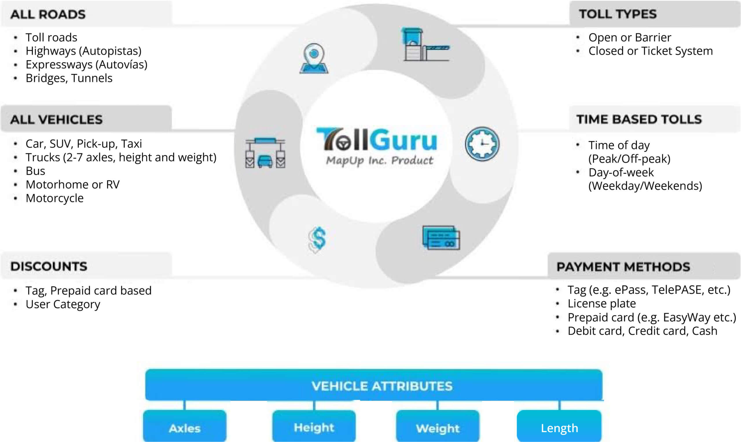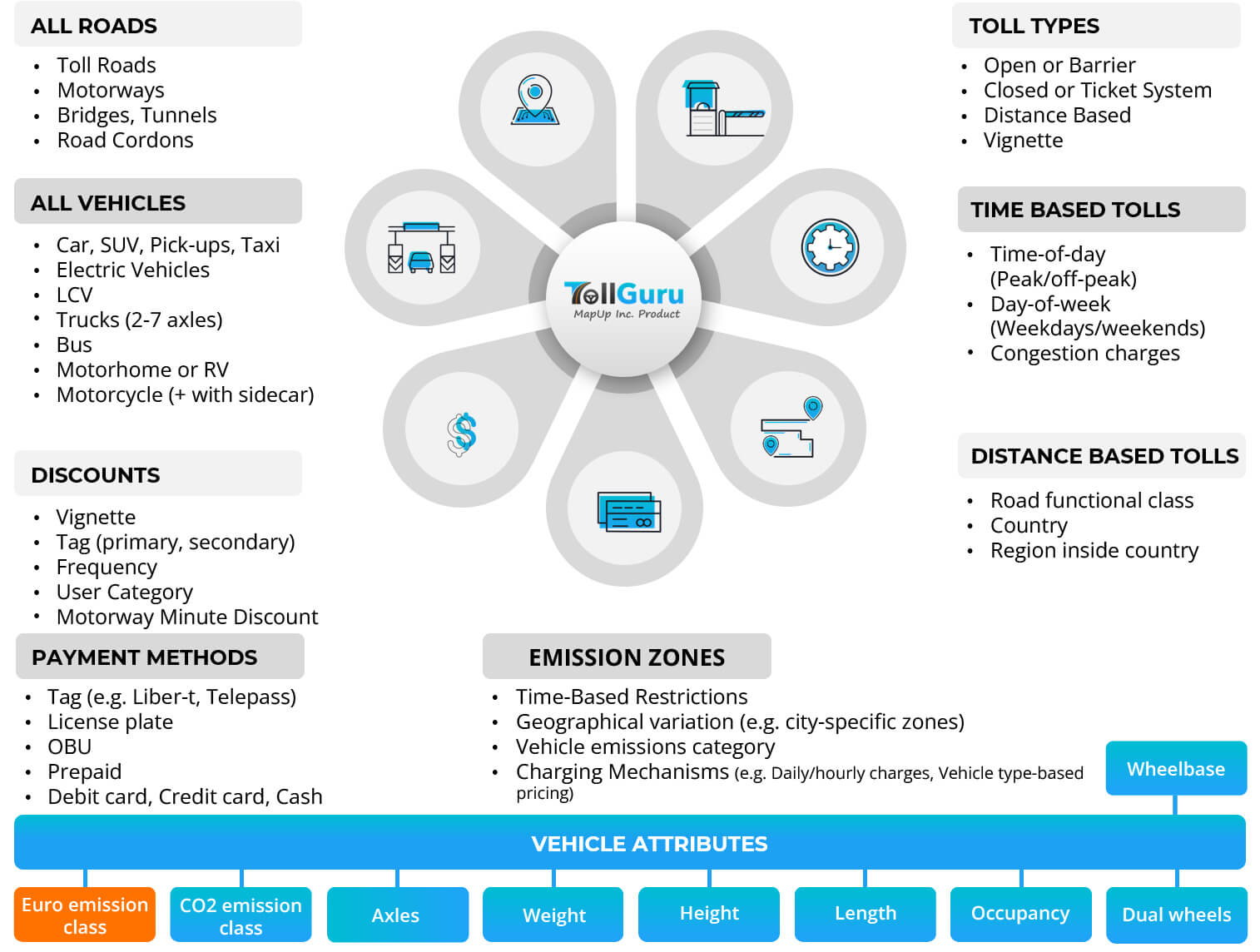 The TollGuru API provides region-specific toll information to help businesses and individuals accurately calculate and optimize trip costs. Each region has unique parameters based on its local requirements. Visual representations of these parameters for each region are included for clarity.